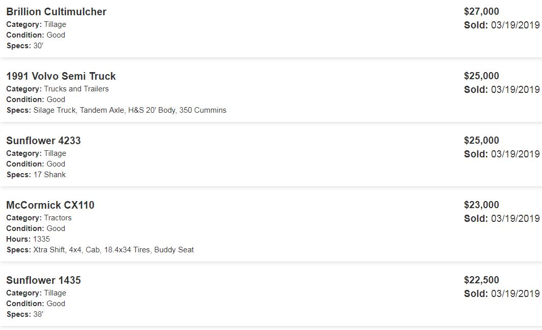 Here’s a link to searchable list 2,729 farm equipment items of all types for sale on Upcoming Auctions all over, click on the link then use the search filters on left side of screen: https://www.machinerypete.com/calender/listings