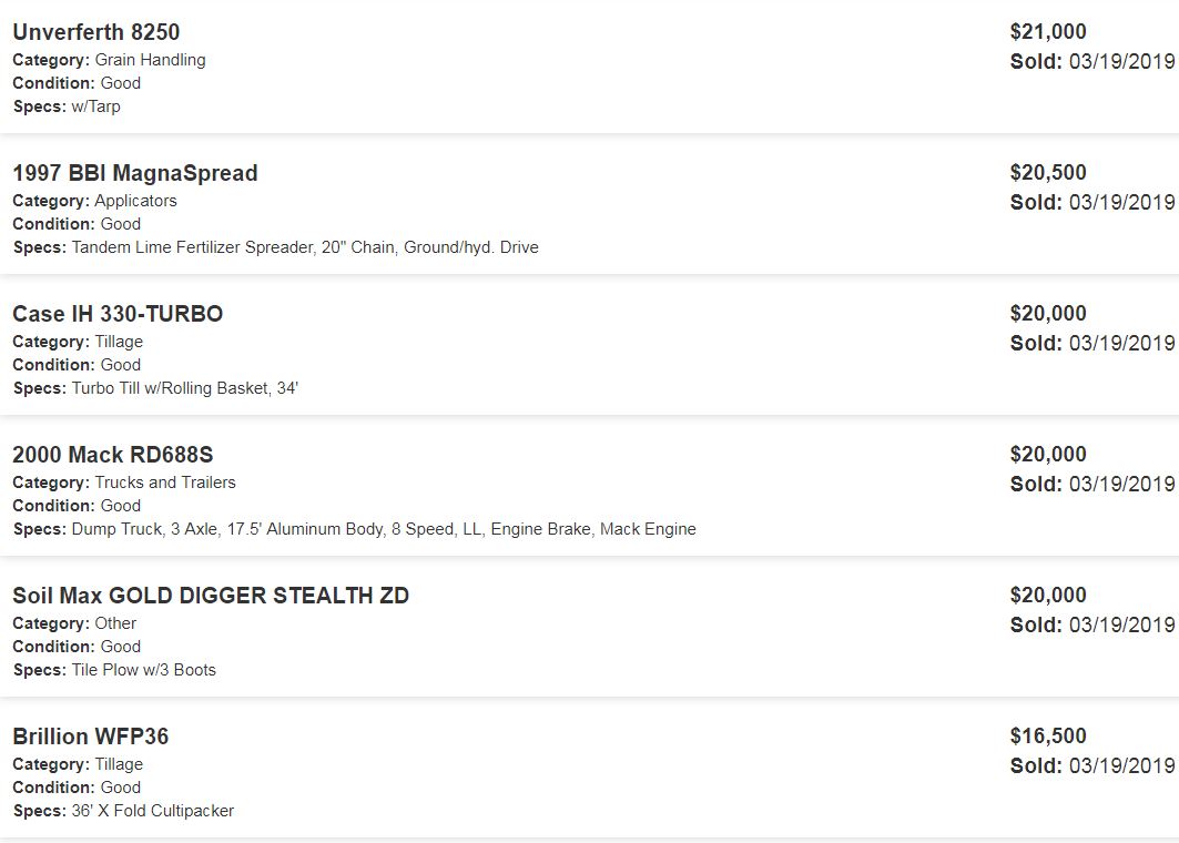 SALE PRICE REPORT - ALVIN SMITH FARMS AUCTION WESTERN NY 3/19/19